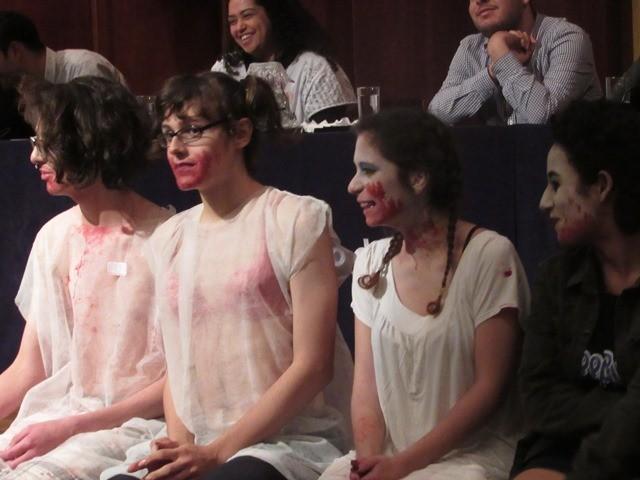 A educanda Thainara também contou sobre a divisão de tarefas entre os participantes da turma. "Participo como atriz, produtora executiva, cuidando da parte burocrática por trás do espetáculo junto com a Thais, e roteirista. Eu e a Melissa, uma das atrizes, fomos as responsáveis por cuidar do roteiro: todos escreveram seus monólogos, mas nós cuidamos da edição e da escrita de algumas coisas que faltavam. Foi um trabalho duro escrever um roteiro como esse", relembra. O restante do grupo se dividiu na produção do cenário, figurino, e maquiagem.
